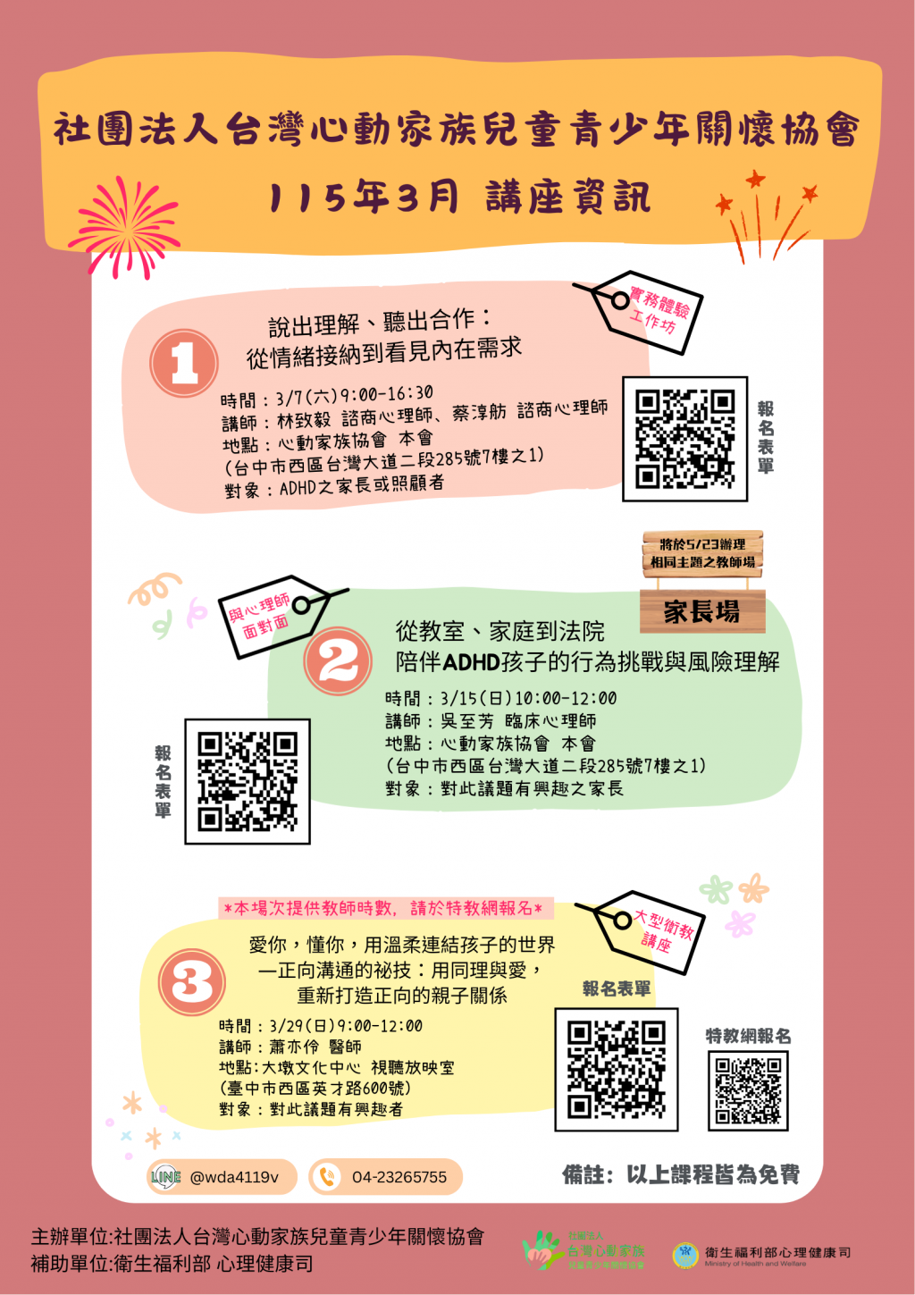 轉知:台灣心動家族兒童青少年關懷協會辦理「115年03月 ADHD 相關主題講座及工作坊」