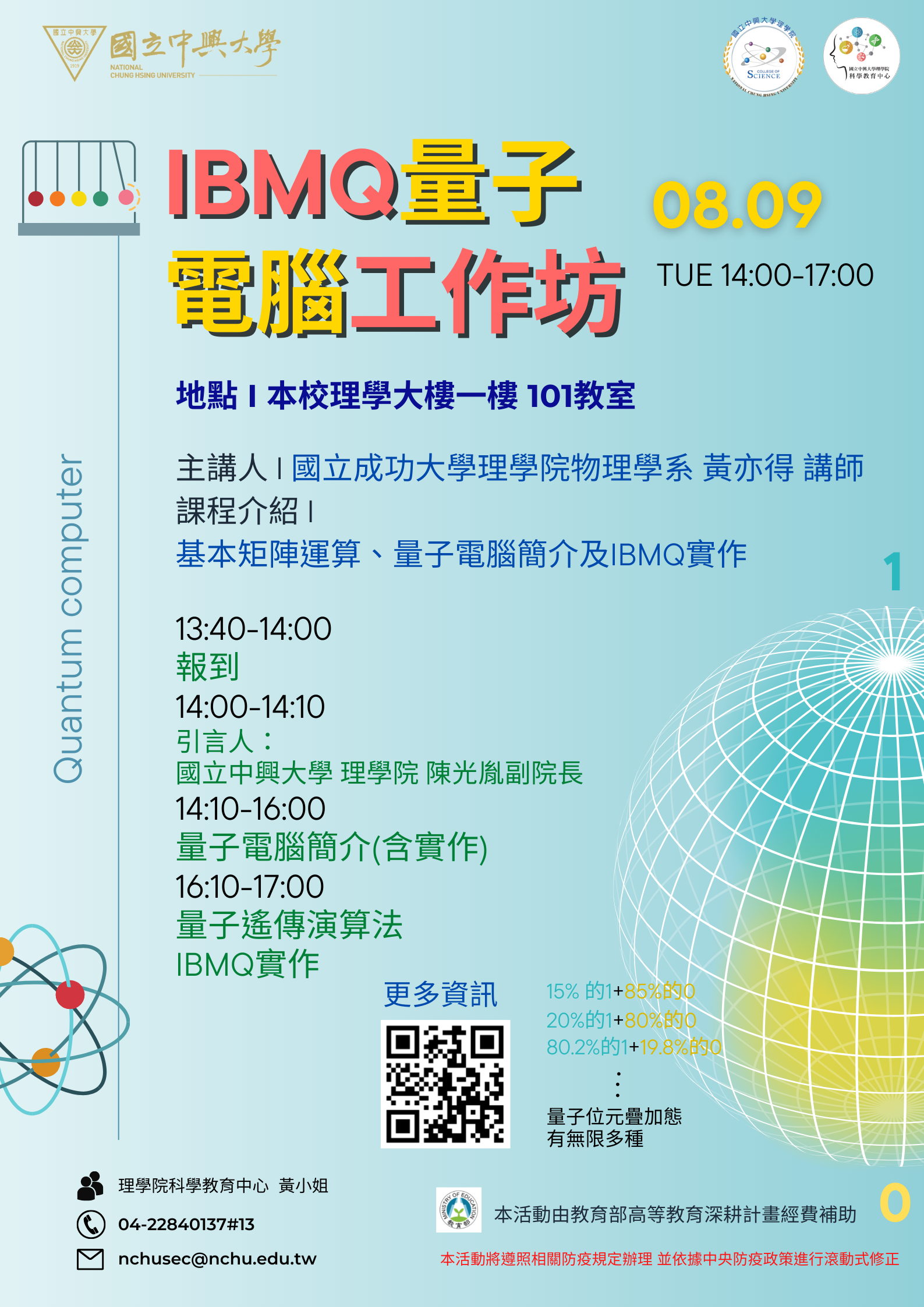 | 一、 | 研習內容:基本矩陣運算、量子電腦簡介、量子遙傳演算法及IBMQ實作,詳見附件海報。 |